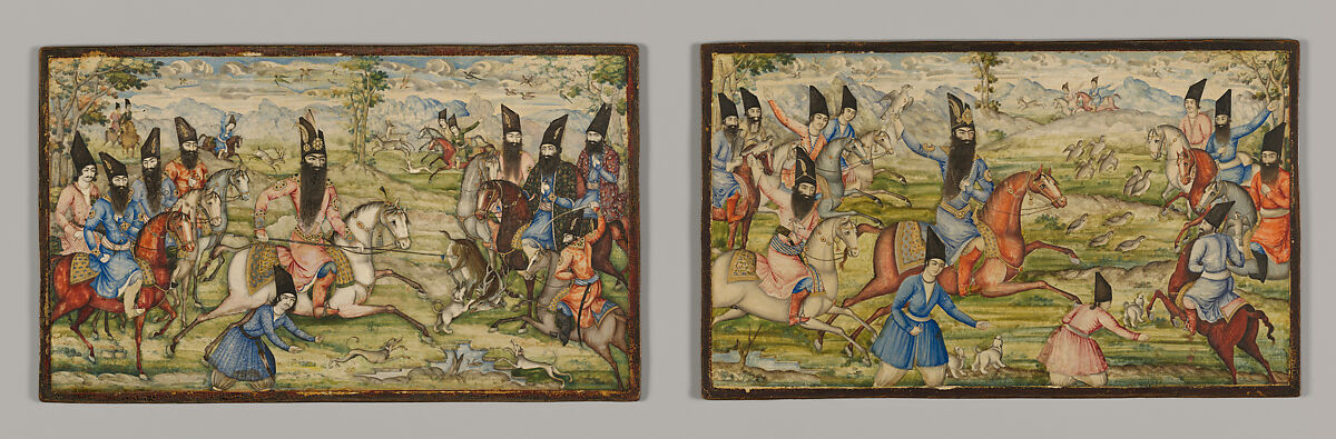 These lacquer panels depict Fath 'Ali Shah, second ruler of the Qajar dynasty (r. 1797–1834) and his sons and courtiers engaged in the royal pursuit of hunting. In one panel the shah and his sons are depicted as falconers and in the other the group is hunting stags. Attention has been lavished on the realistic rendition of the faces to the extent that it is possible to identify a few of the princes represented. Two of them may be Crown Prince 'Abbas Mirza (d. 1833), who was to succeed the shah, and prince Muhammad Ali Mirza. Here, the interest in naturalism is particularly noteworthy since the panel was most likely painted before the introduction of photography into Iran in circa 1844.