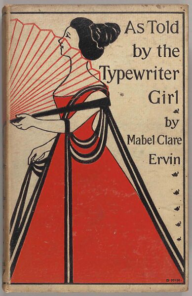 Cream cloth with woman in evening dress holding a transparent fan stamped in black and red, title and author stamped in black, fan continues over spine and onto back cover where design in repeated in reverse; title, author, and publisher also stamped in black on spine. Signed B.MCM. [Blanche McManus]