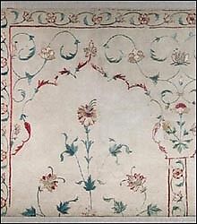 This embroidered textile is inspired by the style of pietra dura decoration of Shah Jahani architecture, where semi-precious stones are inlaid in white marble in floral designs to form gracious arabesques and scrolling vines. Here we see the upper part of a hallmark Mughal design of a cusped arch resting on columns with a naturalistically depicted flowering plant below.