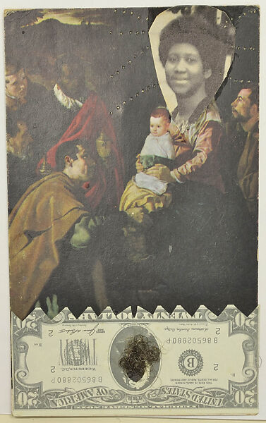 Ted Joans was a poet, musician, and visual artist, whose work intersects with many intellectual, political, and social movements of the twentieth century. A close friend of famed jazz musician Charlie Parker, Joans adopted the motto, "Jazz is my religion, surrealism is my point of view," not only to describe the forms of his artistic improvisation, but his personal attitude to life. In 1990 he began Some Sum (of our Ancestors were Old Masters too!), a series of collages on souvenir art postcards in which he inserted a Black figure into the composition or covered the face of an existing figure with that of a Black man or woman. Often the latter were musicians and singers such as James Brown, Aretha Franklin, and Stevie Wonder, among others. Drawing on the legacy of Surrealism, Joans's collages produce both humorous insights and razor-sharp critiques of mainstream cultural criteria for determining historical worth, aesthetic taste, and financial value.