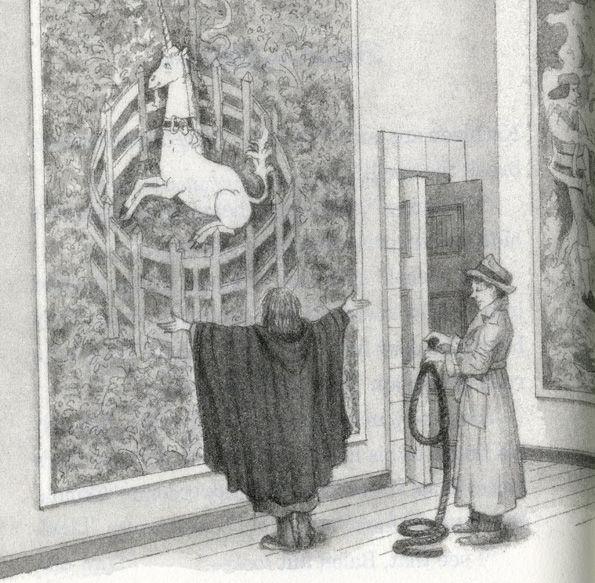 The characters Grinda and Balor attempt to awaken the Unicorn in Captivity in Blizzard of the Blue Moon (New York: Random House, 2006).