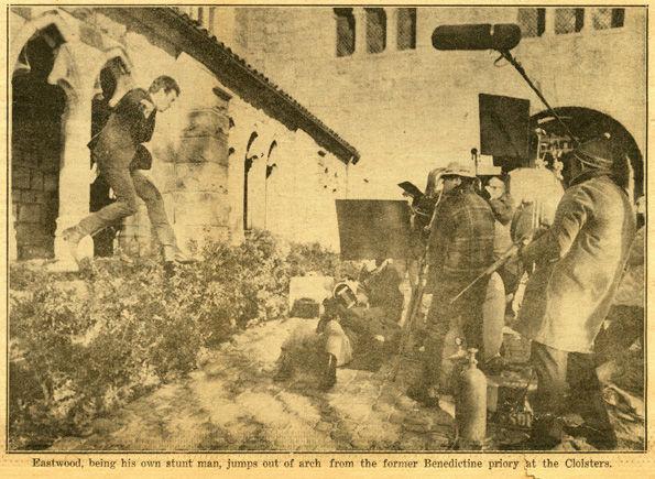 Clint Eastwood leaps from one of the windows of the Froville arcade during filming of Coogan's Bluff at The Cloisters. NY Daily News, Nov. 21, 1967