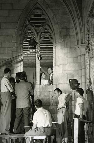 Joseph Cotton and Lillian Gish pose in the Cloister from Saint-Michel-de-Cuxa during the filming of Portrait of Jennie in 1947.