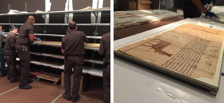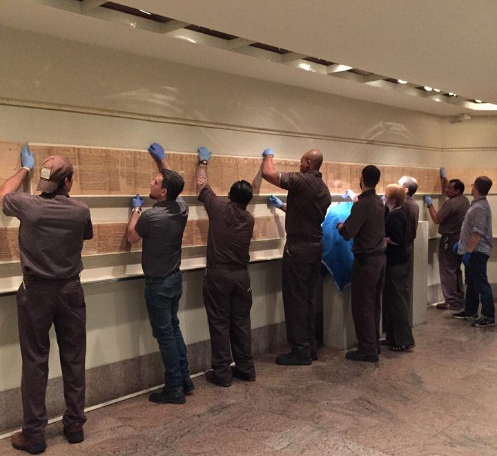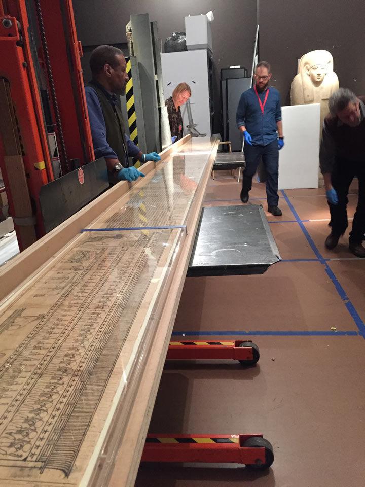 Riggers and technicians deinstalling a section of the Book of the Dead of the Priest of Horus, Imhotep in June 2015. Photo by author