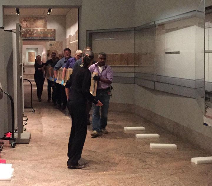 A procession of techs carrying the first long papyrus section to the new case. Photo by author