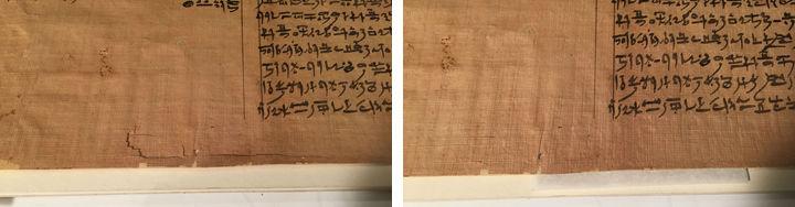 Before (left) and after (right) views of a repair that I made using a remoistenable adhesive tissue applied to the back of the papyrus. Photos by author