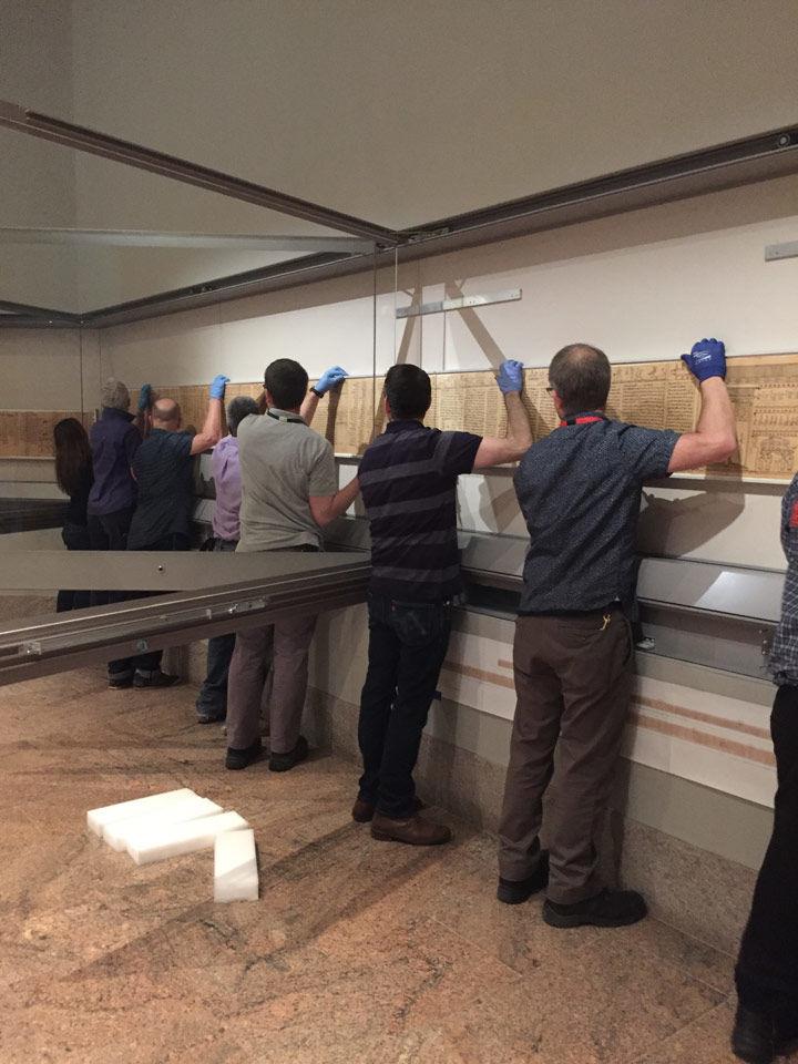 After mounting and framing up all of the sections, it was finally time to reinstall the scroll in the new cases. As was true for almost every step of this project, the reinstallation required attentive teamwork—this time, of technicians from all over the Museum. We watched nervously as they expertly guided the frames into place, and when the last frame was slipped onto its cleat, we all took a moment to celebrate!