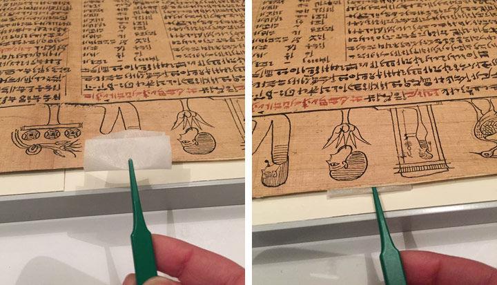Despite the risks involved in transferring the loose papyrus scrolls to new backings, there were also benefits: for one, the new backings would be made of fresh acid-free rag board, ultimately providing an extended and better period of preservation of the scrolls. Additionally, as I was already mounting all the scrolls to the new backings, I incorporated the time to make some needed repairs and to stabilize the papyrus. There was no way we could flip the long scroll over to get to the back, so repairs had to be slipped behind the papyrus as it was face up, using a piece of silicon-impregnated parchment paper to make sure the tissue did not stick to the backing.