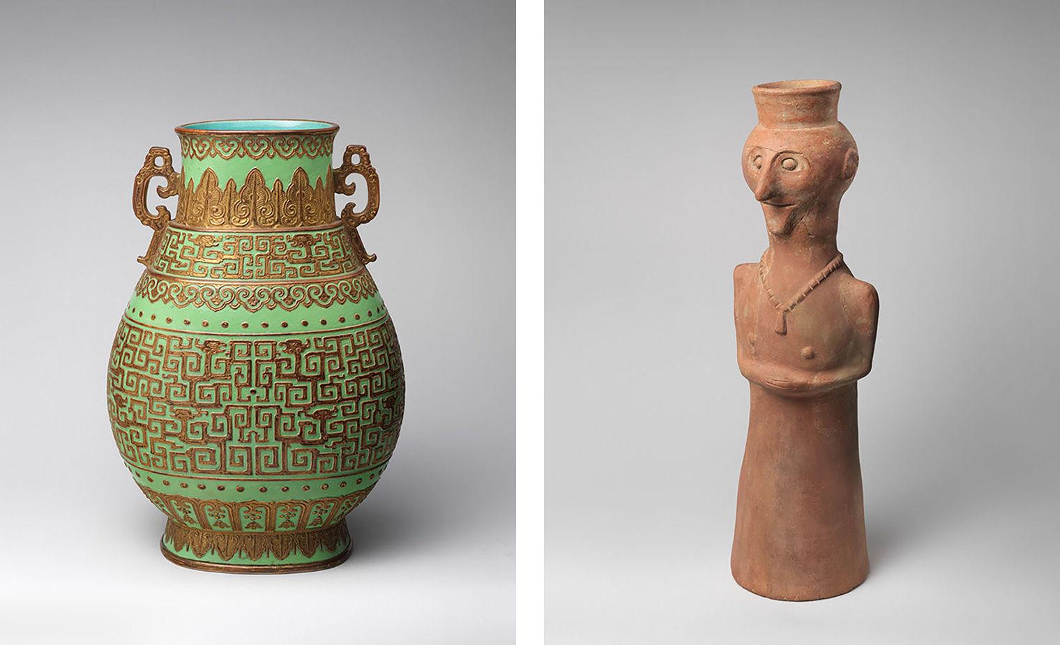 Left: Vase. Chinese, Qing dynasty (1644–1911), Qianlong period (1736–95). Porcelain, 16 in. (40.6 cm). The Metropolitan Museum of Art, New York, Bequest of Benjamin Altman, 1913 (14.40.400). Right: Vessel in form of female (?) figure ca. 7th–6th century B.C. Iran, Luristan, Chekka Sabz. Ceramic, 23 3/4 in. (60.5 cm). The Metropolitan Museum of Art, New York, Purchase, Rogers Fund, 1943 (43.89.3)