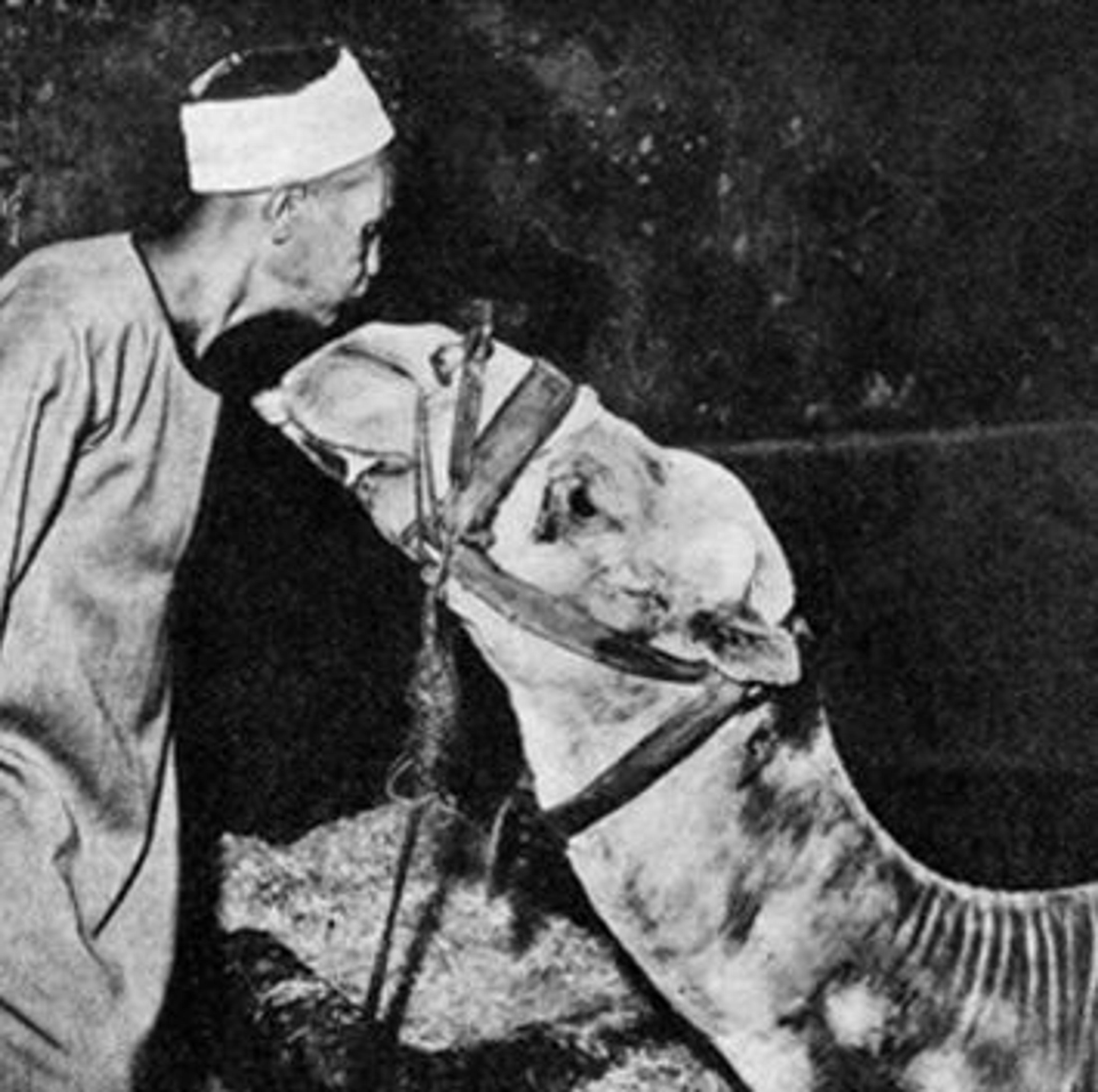 Right: Fig. 4. The camel Mabrouk and his caretaker in the mahmal of 1920, from Sayyid Hamid, "'Nabil' wa-'Mabruk' Hamilan Kaswat al-Ka ba . . . Muwasifat Khassa li-Ikhtiyarha (Siwwar)," Moheet.com, published March 15, 2014.