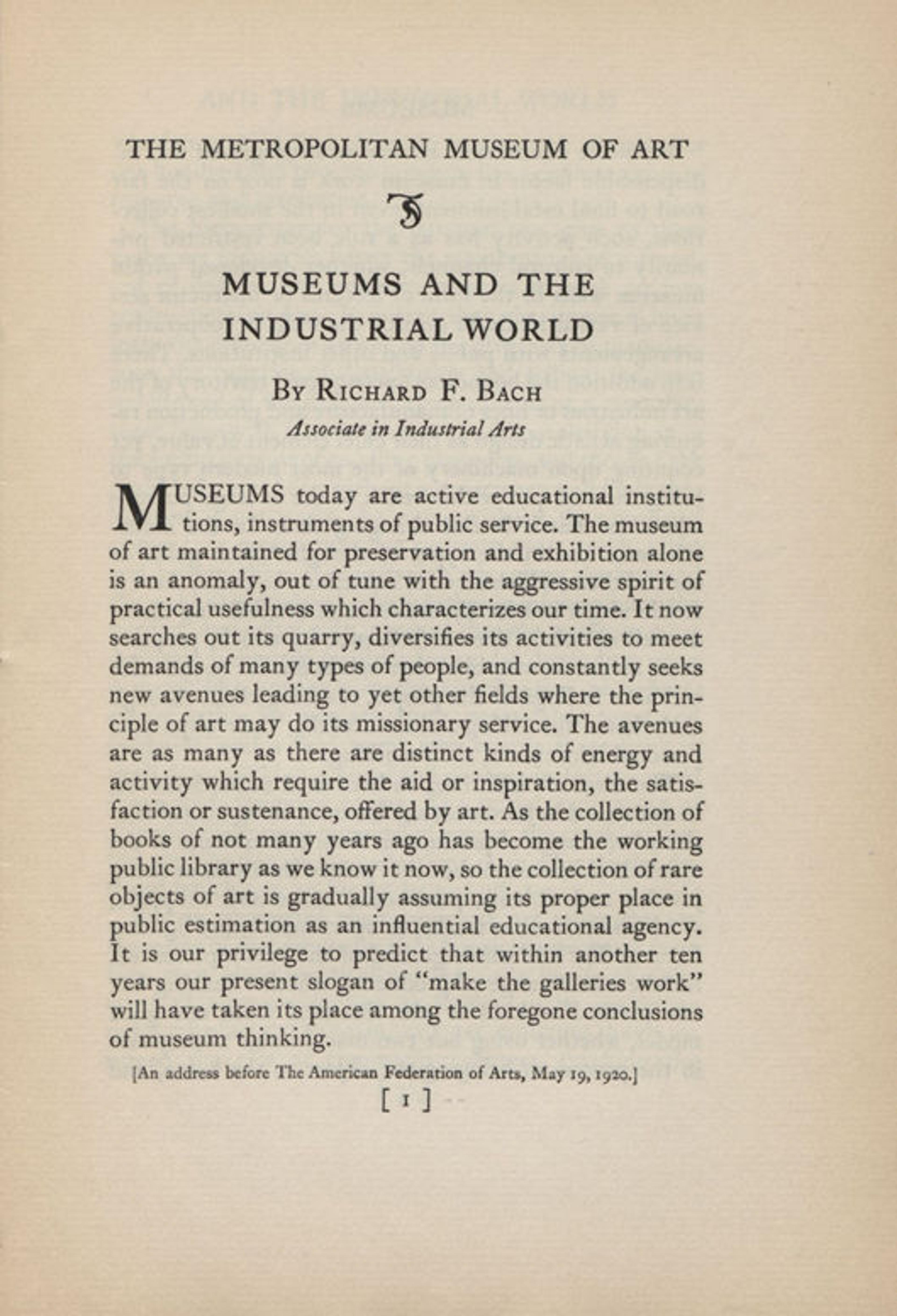 Richard F. Bach, Museums and the Industrial World (detail of page 1). New York: The Metropolitan Museum of Art, 1926. Thomas J. Watson Library (108.1N48 M578)