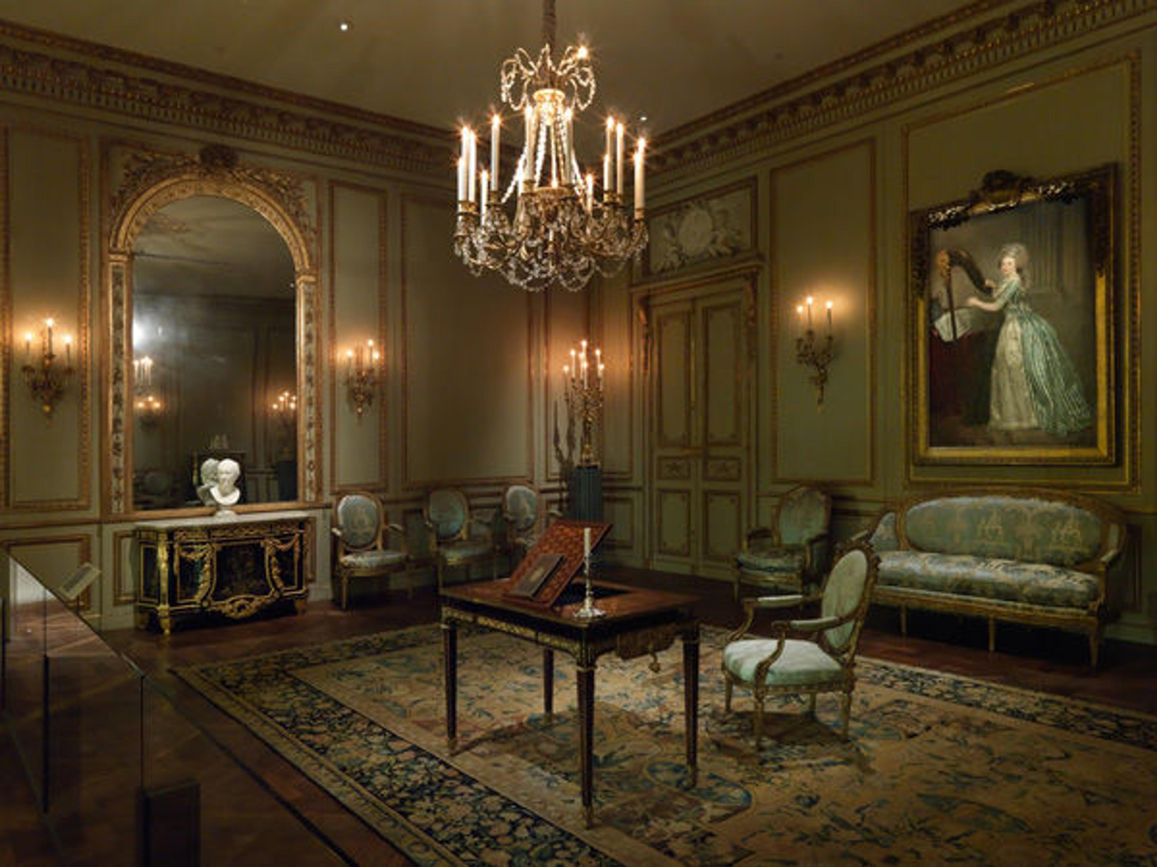 With your invitation in hand, you arrive at the Met, walk toward European Sculpture and Decorative Arts, and into the period rooms. Pastel-colored walls are framed by golden skirting boards and carved motifs. Crystal chandeliers sparkle in the sunlight, casting diamonds on the wall. Lush pillows cushion the chairs seated around a white marble chimneypiece with a monogrammed silk screen, and floor-to-ceiling windows open onto balconies overlooking the park.