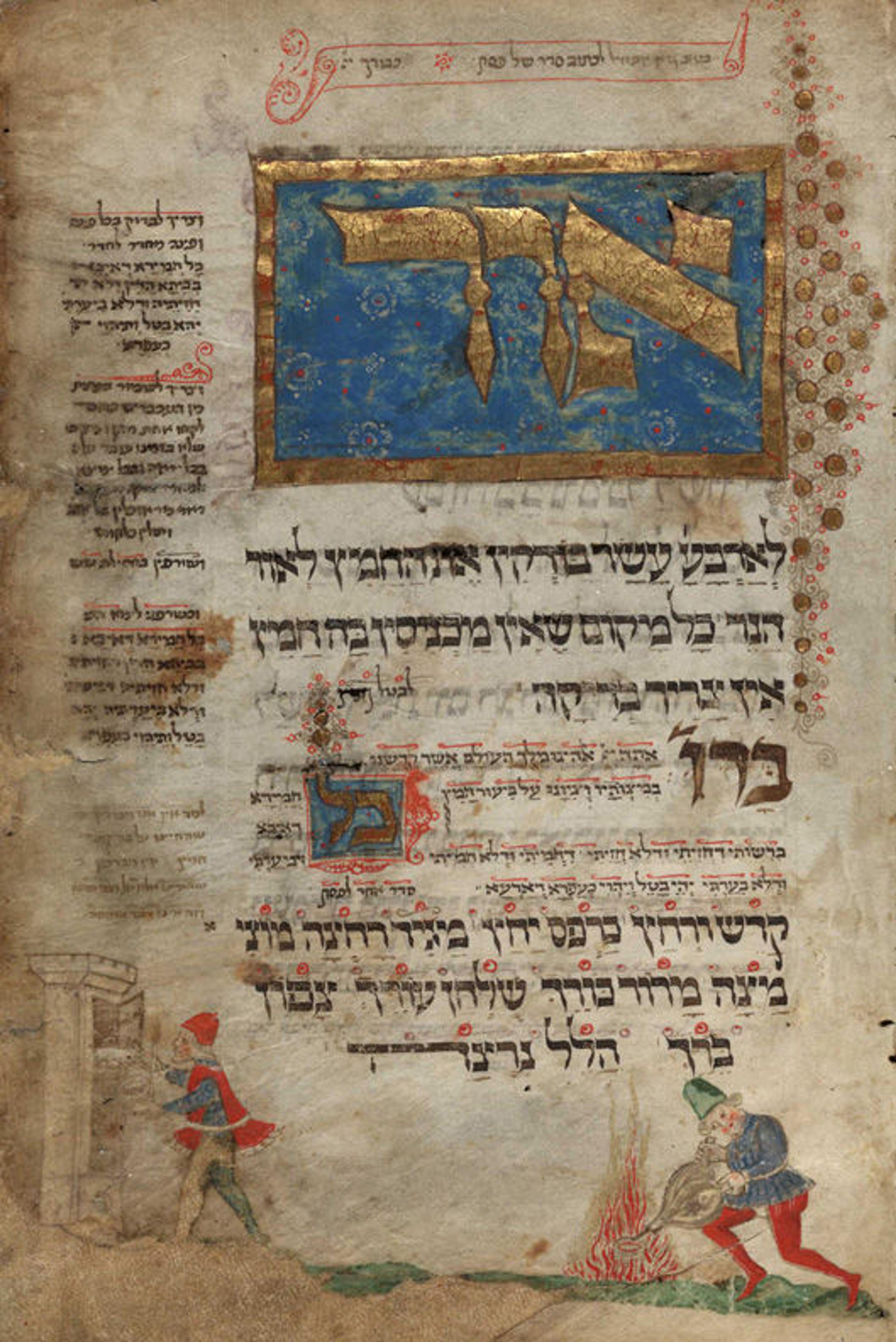 As is typical of Ashkenazic haggadot (made for Jews in Germanic lands), the first line of the Washington Haggadah instructs: "On the eve of the fourteenth [of Nisan] one searches for leaven by the light of a candle." At the bottom of the page, two men carry out the instructions: a bearded man in a red hat holds a lighted taper in one hand as he sweeps crumbs of leavened bread from a tall household cupboard. Behind him, in the open air, another, younger man, in a green hat, vigorously pumps bellows, fanning the flames that consume the bread.