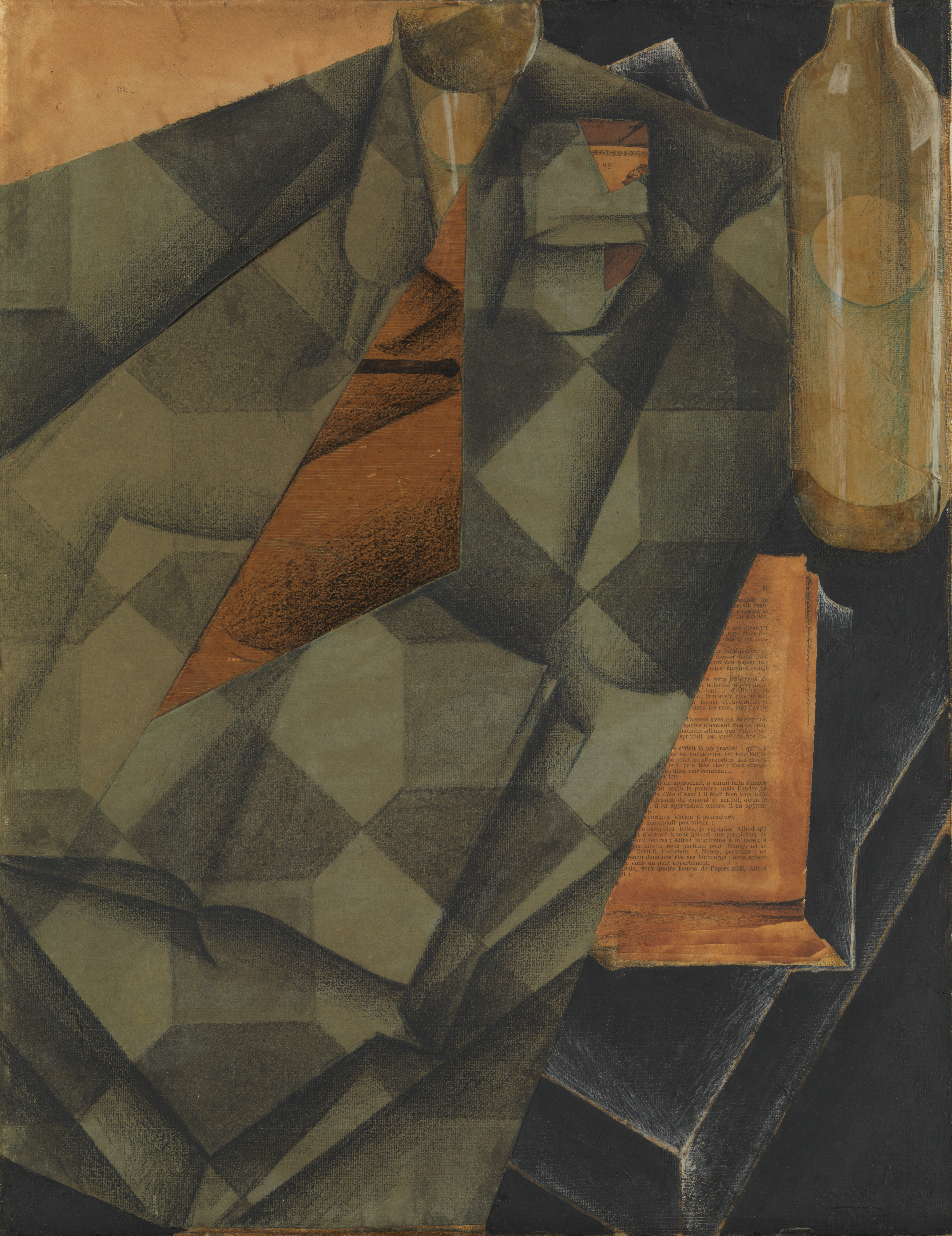 Juan Gris (Spanish, 1887–1927). Book and Glass. Conté crayon, charcoal, wax crayon, watercolor, gouache, oil, cut-and-pasted printed and selectively varnished wallpaper, blue and white laid papers, transparentized paper, and printed white wove papers; adhered overall onto a sheet of torn newspaper, 25 x 19 in. (65 x 50 cm). The Metropolitan Museum of Art, New York. Leonard A. Lauder Cubist Collection, Gift of Leonard A. Lauder, 2021 (2021.395.6)