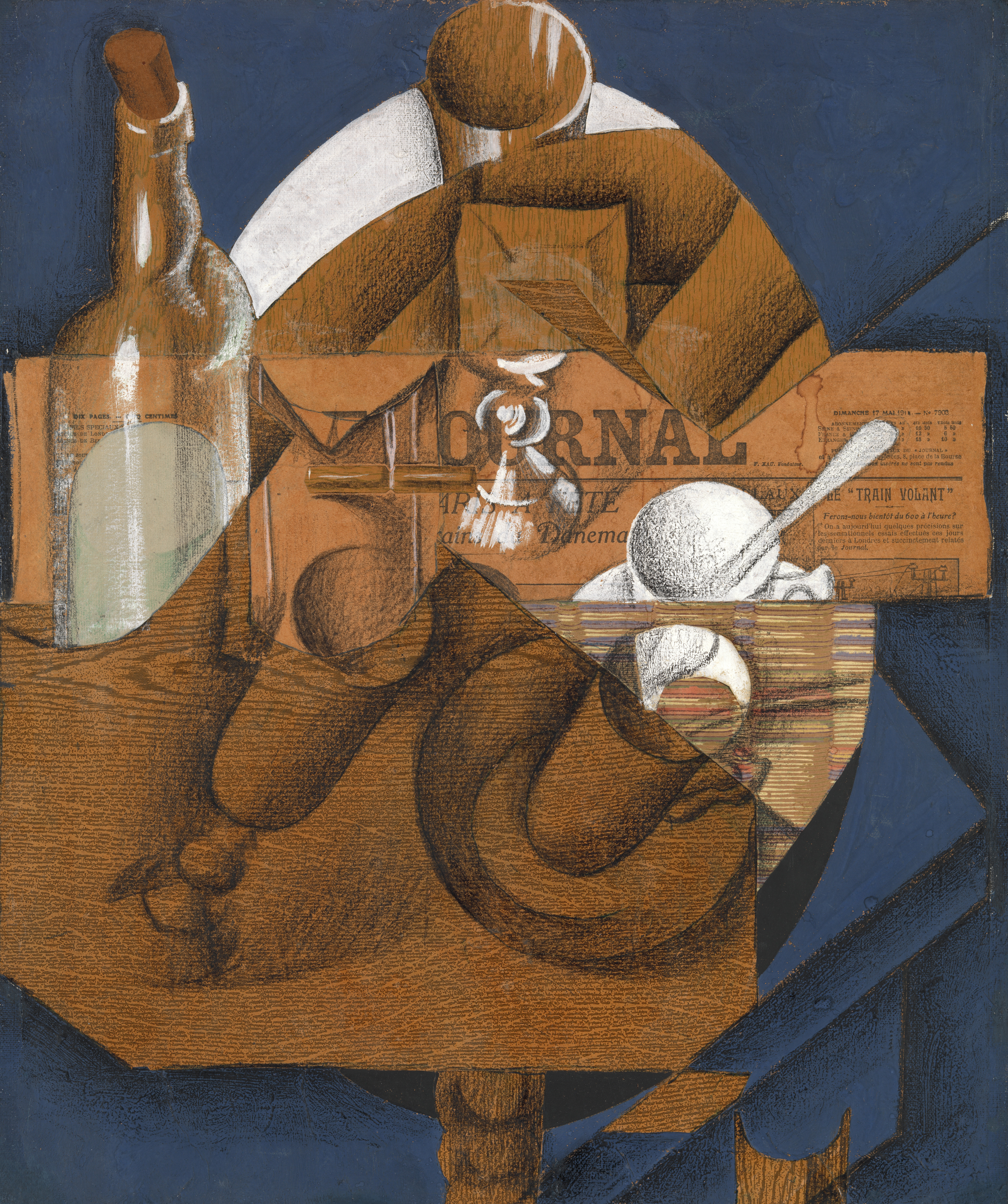 Juan Gris (Spanish, 1887–1927). Cup, Glasses, and Bottle (Le Journal). Conté crayon, gouache, oil, cut-and-pasted newspaper, white laid paper, printed wallpaper (three types), selectively varnished; adhered overall onto a sheet of newspaper, mounted to primed canvas, 22 × 18 in. (55 × 46 cm). The Metropolitan Museum of Art, New York. Leonard A. Lauder Cubist Collection, Gift of Leonard A. Lauder, 2021 (2021.395.4)