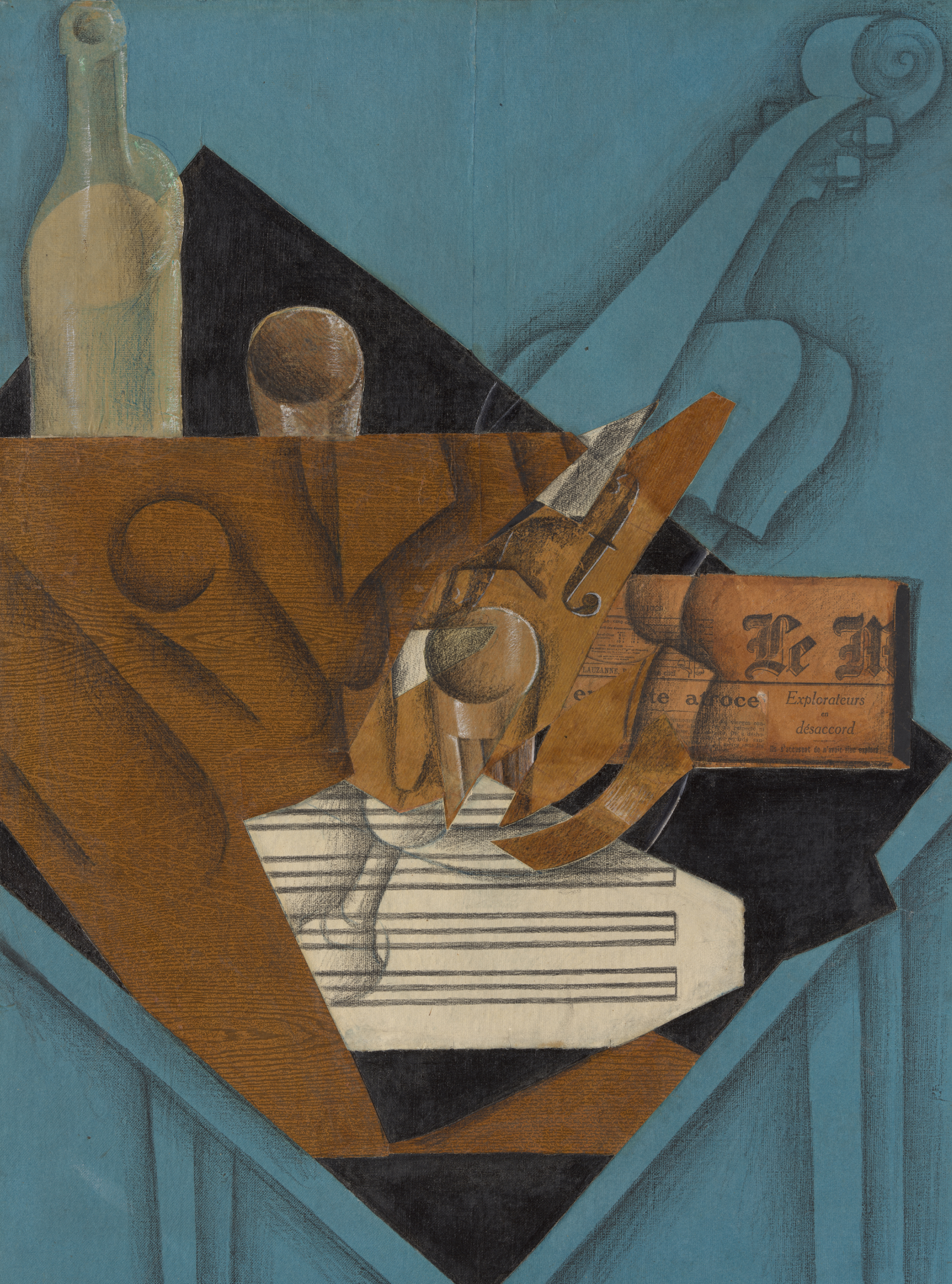 As in most of his collages, Gris used black media at the intersections of the various papers in order to disguise the junctures and create the illusion of seamlessness.