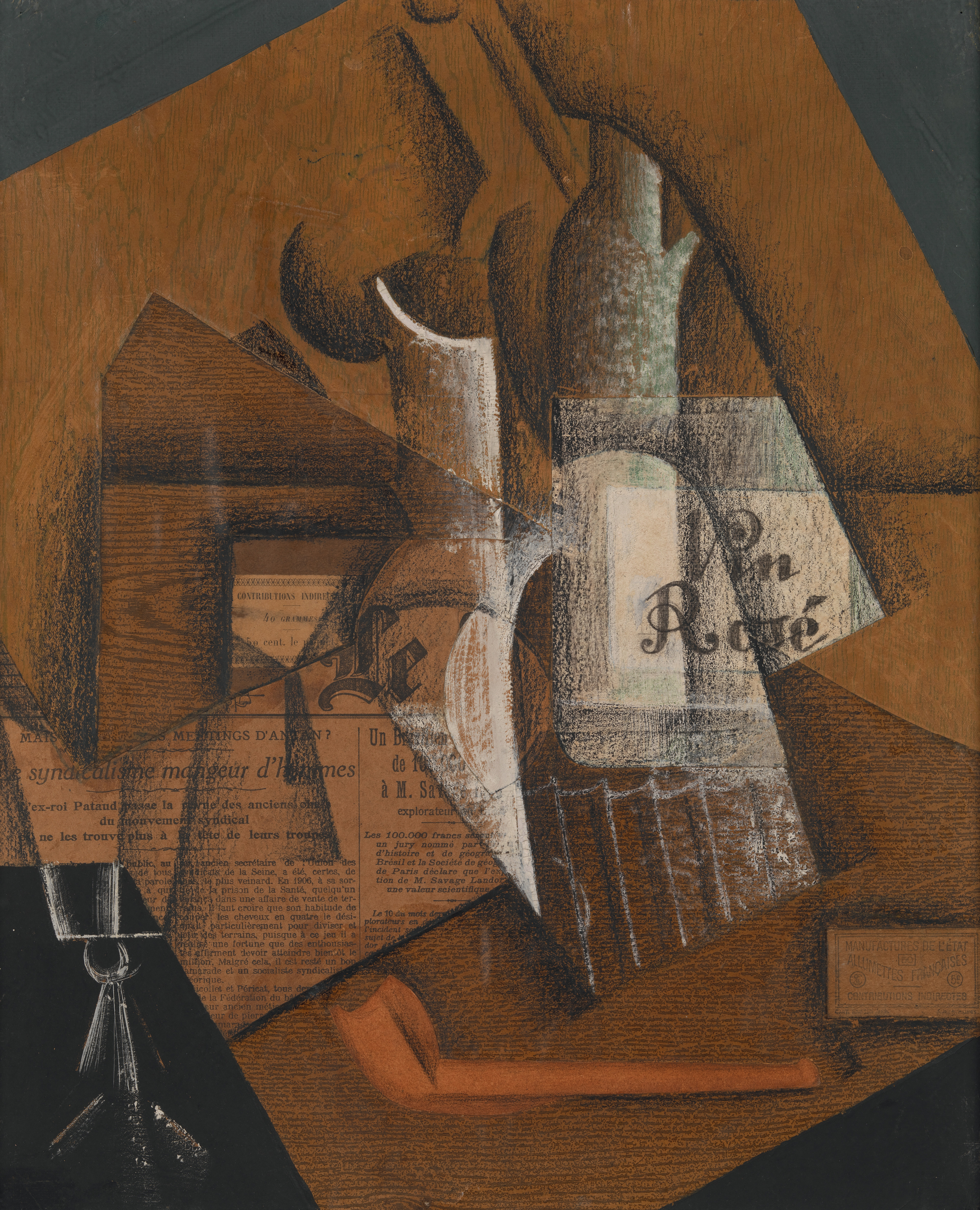 In the center of this composition, Gris applied a faux bois wallpaper printed in brown ink, with the grain running horizontally.