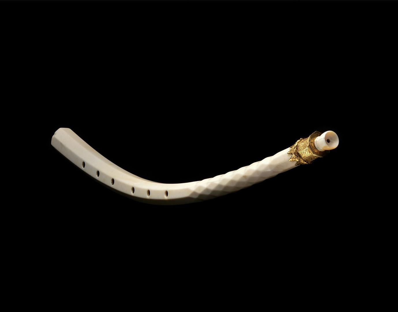 This is an image of a cornetto made of ivory, an instrument I had never heard of before perusing The Met’s collection. It looks like an elongated and warped recorder with six holes and a slight bulge near the bottom.