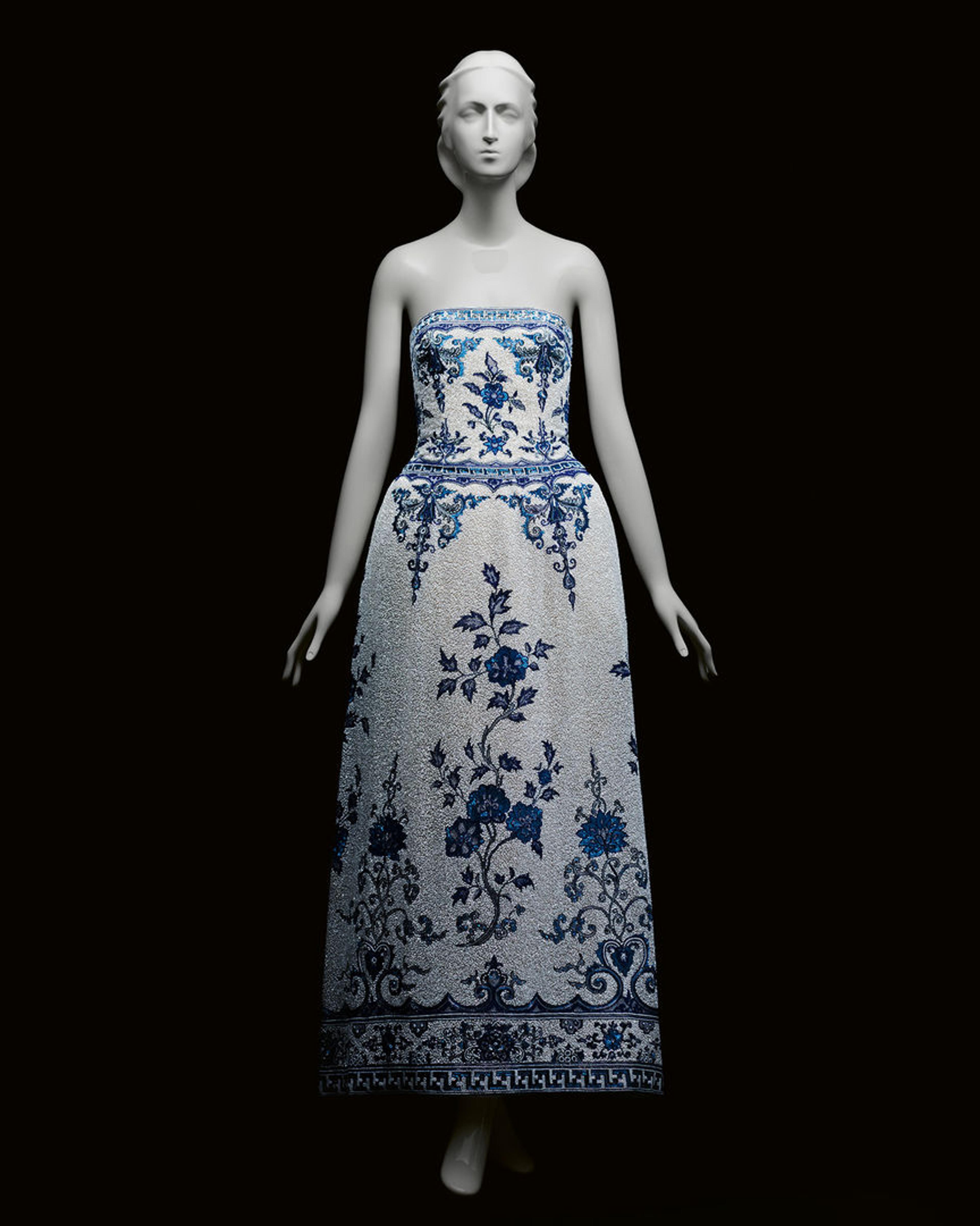 The gown, which Hebe Dorsey described in the International Herald Tribune as one of the “best moments”[5] of the collection, consists of a ground of white silk organza with the painted motifs of the ceramic diligently reconstituted across the gown’s surface with thousands of embroidered blue, white, and clear seed beads and crystals. The total amount of time to achieve this was a remarkable 1,800 hours of handwork.