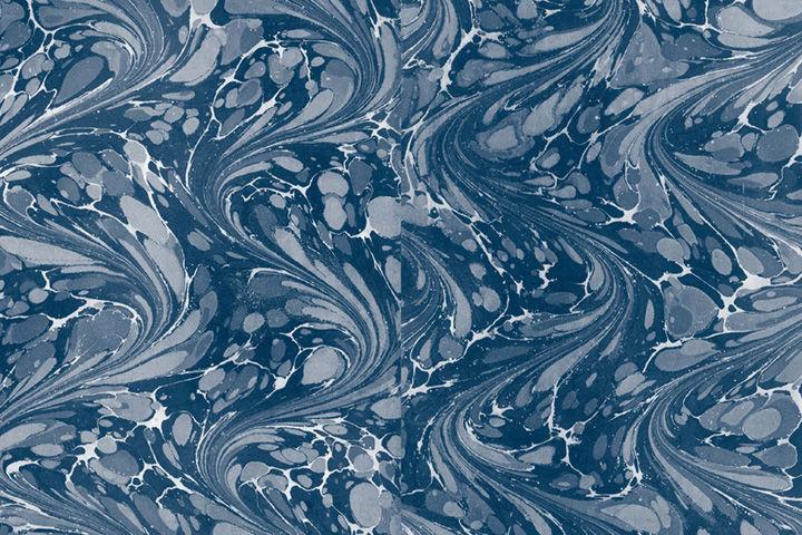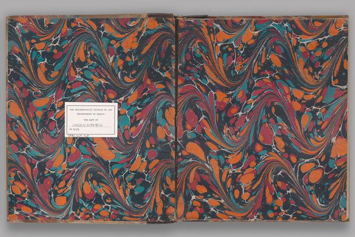 Paul Booth: The three-piece binding of our catalogue definitely quotes those nineteenth-century albums. The original idea grew out of a brainstorming session with the Museum's Publisher and Editor-in-Chief, Mark Polizzotti. We took the concept one step further with endpapers inspired by marbled sheets from a nineteenth-century French book in the collection of The Met's Department of Drawing and Prints. The original pages are richly colored and, for lack of a better word, vulgar—but in a good way! We liked the undulating pattern, but felt the palette didn't jive with the restraint employed throughout our publication. By replacing the original turquoise, orange, and fuchsia with three Pantone (PMS) colors, we achieved a more subtle, quiet impression. There's also a bit of silver mixed in to the ink, as a nod to the treatment of the daguerreotypes.