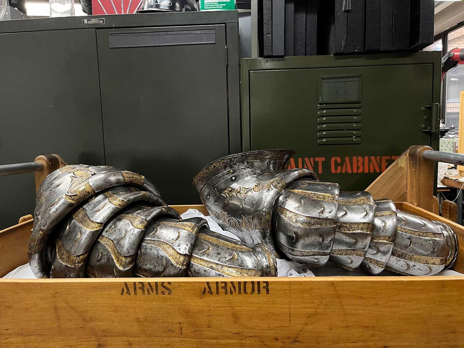 Costume armor awaiting conservation. Kolman Helmschmid (German, 1471–1532). Portions of a Costume Armor, ca. 1525. Steel, copper alloy, gold, H. 27 in. (68.6 cm); W. 18 in. (45.7 cm); Wt. 24 lb. 3.24 oz. (10.978 kg).The Metropolitan Museum of Art, New York, Backplate and rump: Gift of Bashford Dean, 1924; vambraces: Mrs. Stephen V. Harkness Fund, 1926; top lames of vambraces: Bashford Dean Memorial Collection, Funds from various donors, 1929 (24.179; 26.188.1, .2; 29.158.363a, b)
