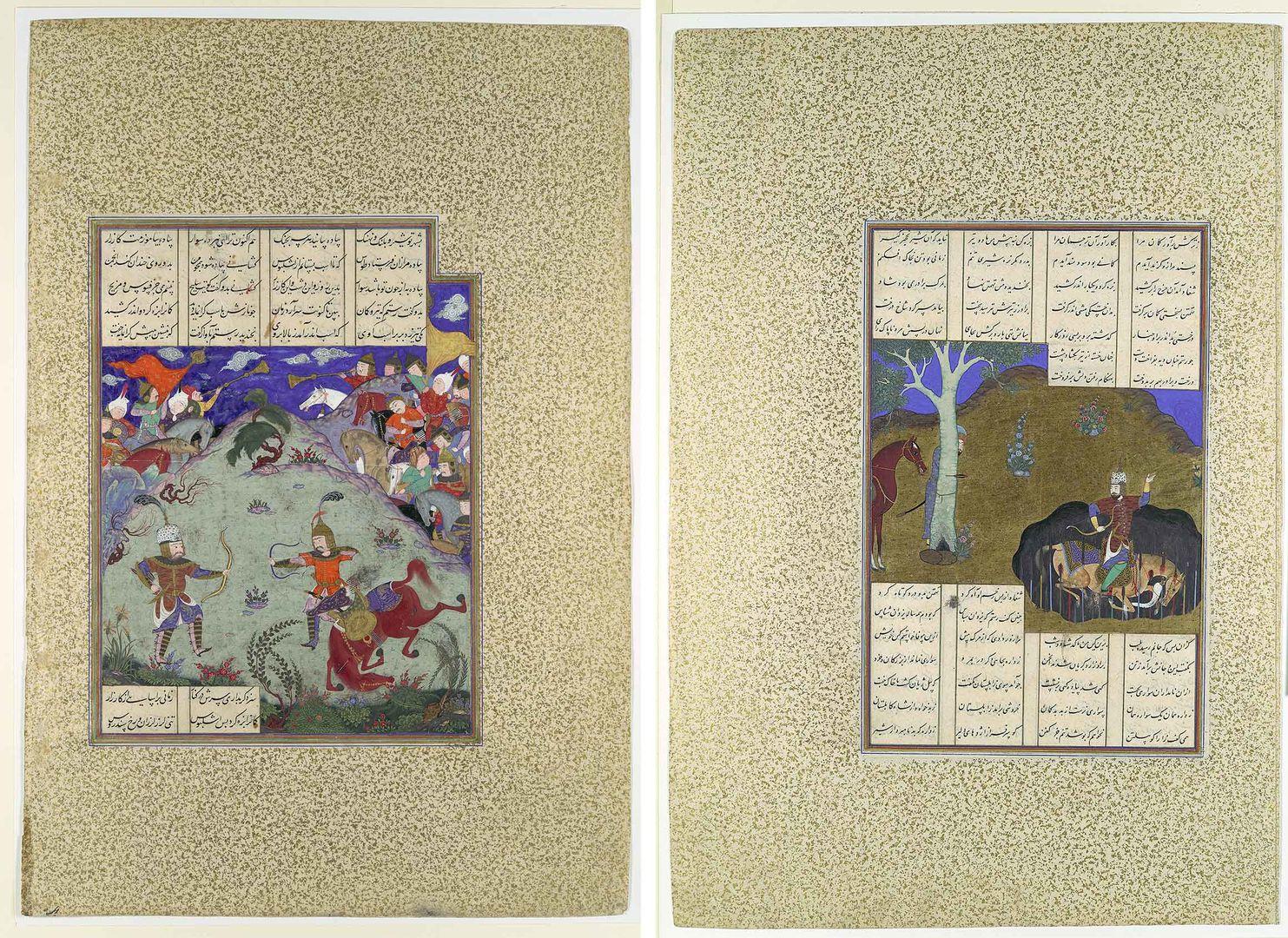 Two folios from the Shahnema featuring stories of Rostam. Left: Abu'l Qasim Firdausi (Iranian, ca. 940/41–1020), Painting attributed to Bashdan Qara (Iranian, active ca. 1525–1535). “The Combat of Rustam and Ashkabus”, Folio 268v from the Shahnama (Book of Kings) of Shah Tahmasp, ca. 1525–30. Opaque watercolor, ink, silver, and gold on paper, H. 18 5/8 in. (47.3 cm), W. 12 5/8 in. (32.1 cm). The Metropolitan Museum of Art, New York, Gift of Arthur A. Houghton Jr., 1970 (1970.301.40). Right: “Rustam Avenges His Own Impending Death”, Folio 472r from the Shahnama (Book of Kings) of Shah Tahmasp, ca. 1525–30. Opaque watercolor, ink, silver, and gold on paper, H. 18 5/8 in. (47.5 cm), W. 12 5/8 in. (32.1 cm). The Metropolitan Museum of Art, New York, Gift of Arthur A. Houghton Jr., 1970 (1970.301.56)
