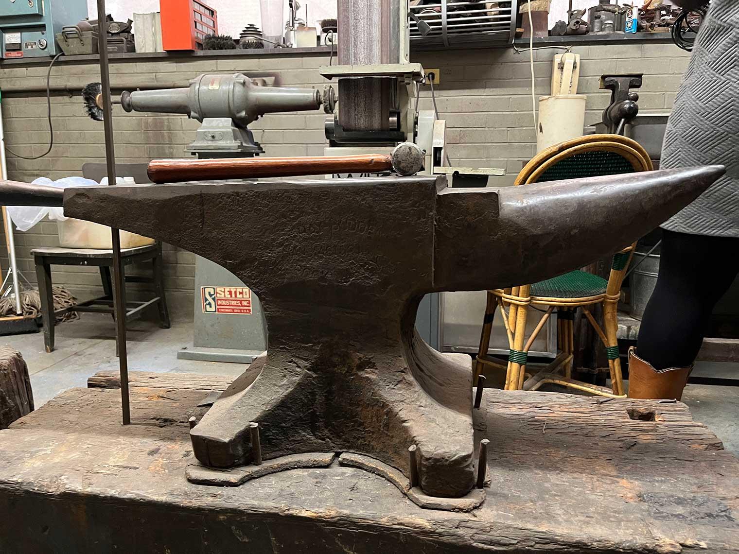 HUNTER: This was made in Brooklyn. I think it was 1908. At a time when there were still a lot of horses in the city, and all kinds of manufacturing. At one point, New York City was the number one manufacturing center of the world. You know: all those people needed tools. So tools were made in New York City, including big humongous anvils like this one, which is like a 350 pound anvil mounted on a, on a block of wood that’s at least as old as this anvil. Might be older; I don’t know. But the tree itself had, had to have been a hundred years old when it was cut. So I’m looking at like, you know, two hundred years of wood here. With this 350 pound iron solid steel anvil on top. Made here in New York City. And it’s been sitting here in this room, now, close to seventy years. And, uh, [Sound of a hammer striking an anvil] I hit it with a hammer all the time.