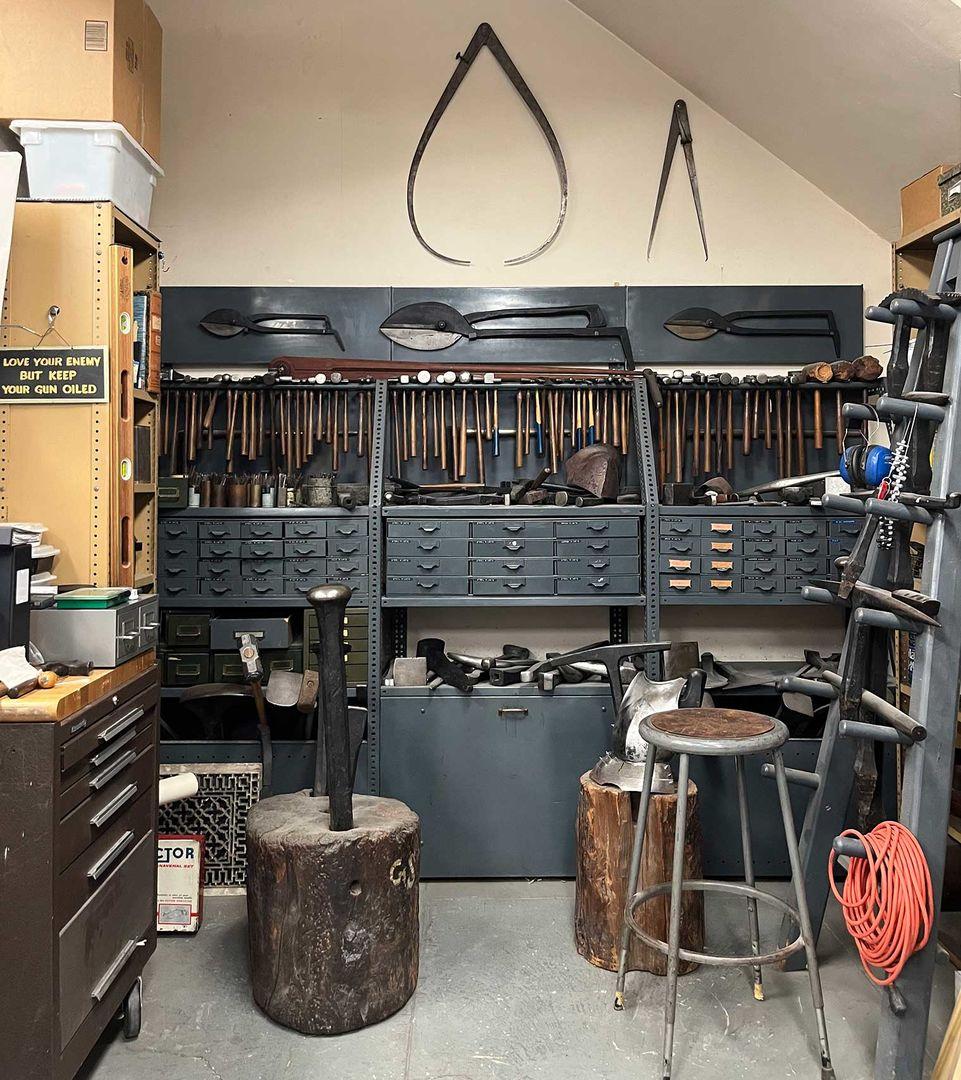 Back in the basement armory, there’s metal everywhere: cabinets full of different size scraps, drawers with labels like “Tools of Unusual Purpose,” or “Science!” There are rows of hammers, and some gigantic, functional, antique shears hanging on the wall.