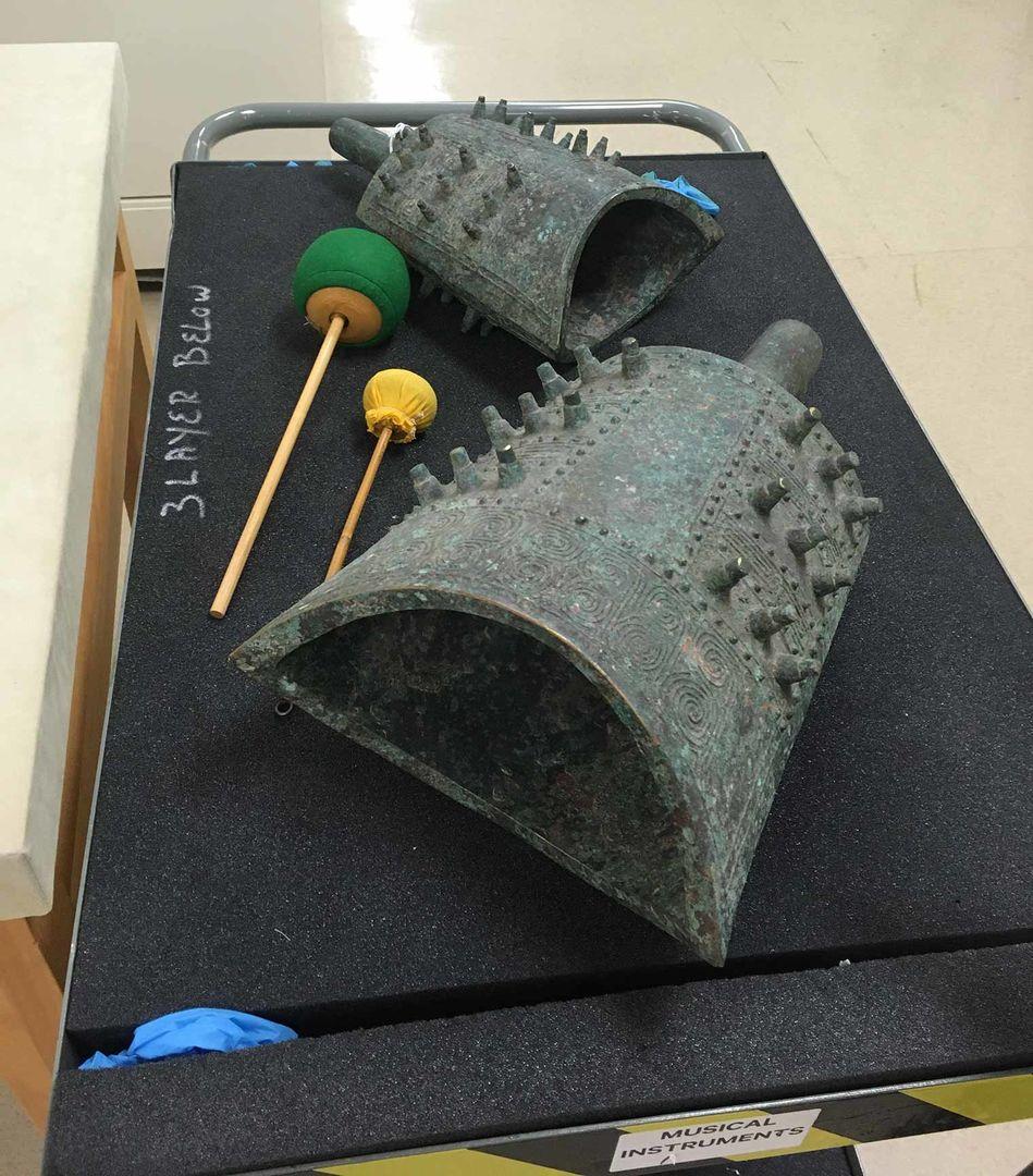 Two zhongs from The Met collection ready to be rung for the first time in one hundred years
