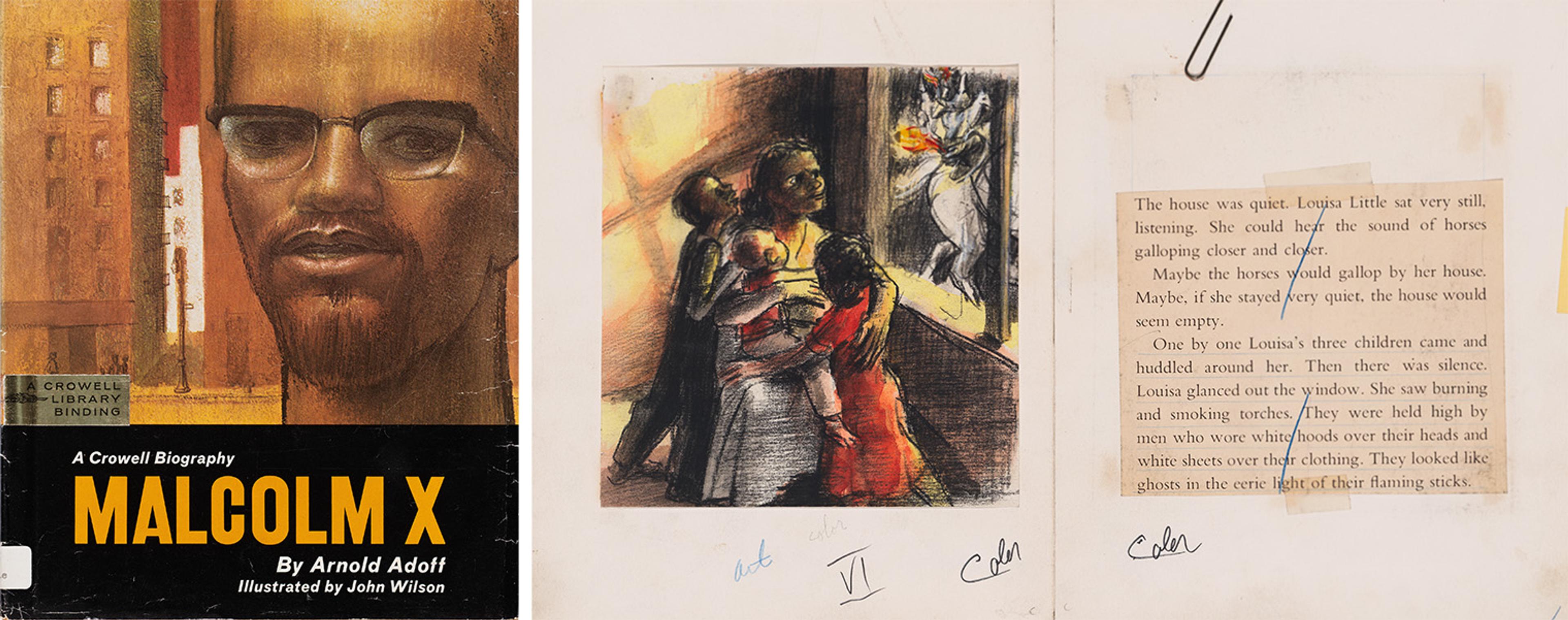 Left: John Wilson (American, 1922–2015). Cover of Malcolm X, 1970. Illustrated children's book. Text by Arnold Adoff (American, 1935-2021). 9¼ × 7¾ in. (23.5 × 19.7 cm). Collection of Elizabeth and Vivienne Maiden, NY. Right: Study for Malcolm X, 1970. Collection of Julia Wilson, courtesy of Martha Richardson Fine Art, Boston