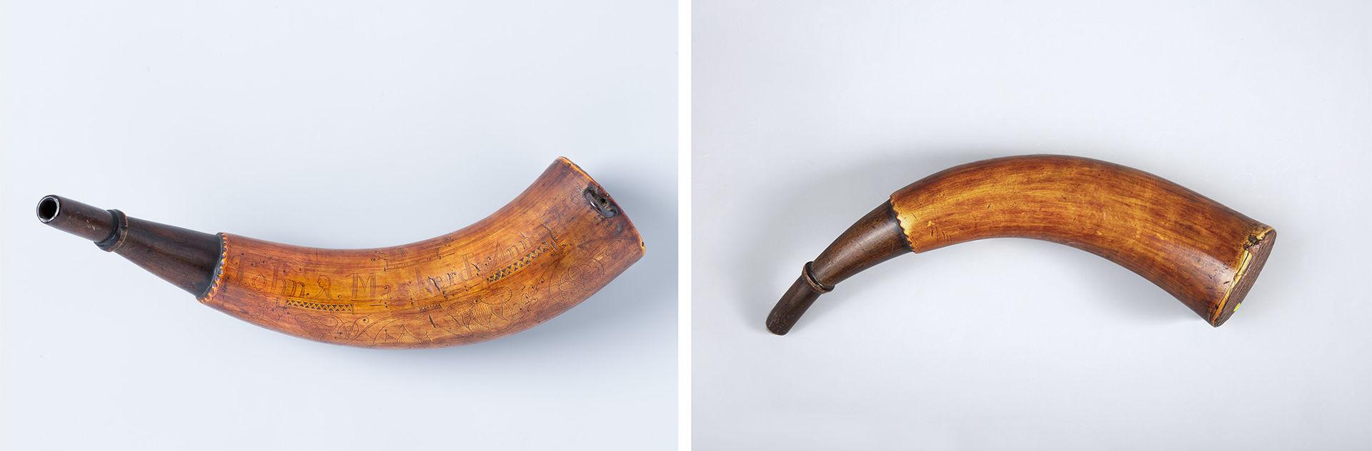 Left: Engraved by John Bush (American, ca. 1725–ca. 1758). Powder horn of John Mahard, dated 1756. Colonial American. Cowhorn, wood, iron, L. 12 3/8 in. (31.5 cm); Max. diam. 2 3/4 in. (6.8 cm); Wt. 7 5/8 oz. (216 g). The Metropolitan Museum of Art, New York, Purchase, Friends of Arms and Armor Gifts, 2021 (2021.429). Right: Same horn pictured at left, opposite side