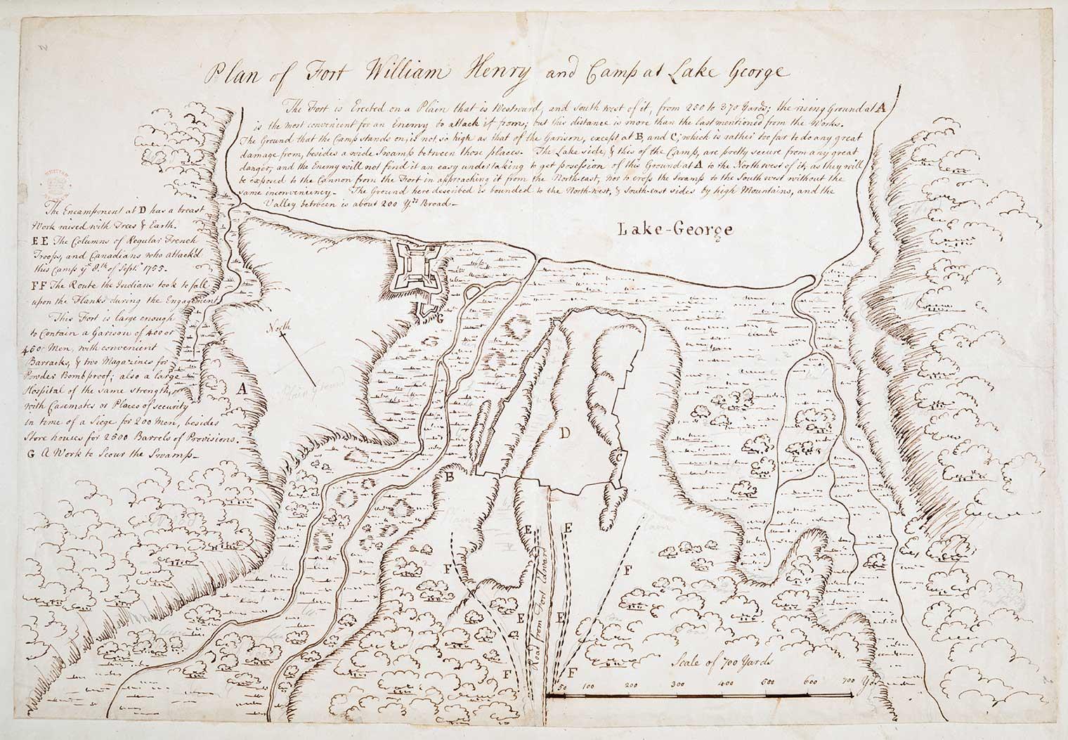 William Eyre (d. 1765). Plan of Fort William Henry and Camp at Lake George, ca. 1755. English. Manuscript pen and ink, over pencil, 31 x 46 cm. British Library, MS 15535