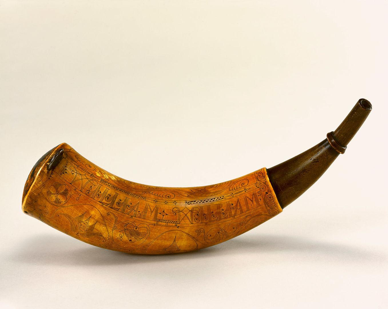 Engraved by John Bush (American, ca. 1725–ca. 1758). Powder horn of William Williams, ca. 1756. Colonial American. Cowhorn, wood, iron. Historic Deerfield, Deerfield, Massachusetts, The William H. Guthman Collection of American Engraved Powder Horns (inv. HD 2005.20.6). Photograph courtesy of Historic Deerfield