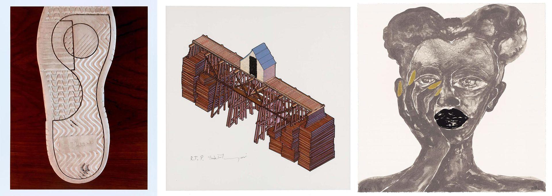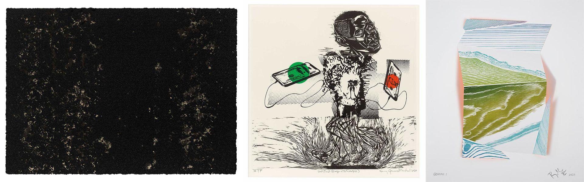 From left to right: Richard Serra. Composite for The Met, 2021. Etching with oil stick in one color on St. Armand White paper, 10 3/4 x 15 in. (27.3 x 38.1 cm) © 2021 Richard Serra; Kerry James Marshall. Untitled (Exquisite Corpse), 2021. Screenprint, woodcut, and linocut in six colors on Somerset Velet Softwhite paper, 15 x 15 in. (38.1 x 38.1 cm) © 2021 Kerry James Marshall; Ranjani Shettar. Alae alae, 2021. Woodcut and screenprint in eight colors, die-cut and folded, on Somerset White and Saunders Waterford papers, 15 x 13 in. (38.1 x 33 cm) © 2021 Ranjani Shettar. All images © 2021 The Met 150