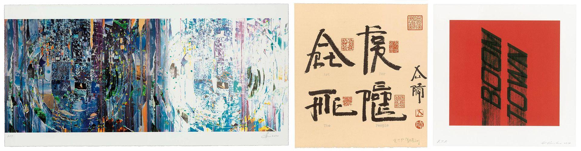 From left to right: Sarah Sze. Papillon, 2021. Screenprint in thirteen colors with embossment on Somerset Satin White paper, 15 x 30 in. (38.1 x 76.2 cm), folded to 15 x 15 in. (38.1 x 38.1 cm) © 2021 Sarah Sze; Xu Bing. Art for the People for The Met, 2021. Each seal functions as a QR code that links to a hidden message. Lithograph in six colors with relief print on Pescia Cream paper, 15 x 15 in. (38.1 x 38.1 cm) © 2021 Xu Bing; Ed Ruscha. Boom Town, 2021. Lithograph in four colors with embossment on Arches Cover White paper, 15 x 15 in. (38.1 x 38.1 cm) © 2021 Ed Ruscha. All images © 2021 The Met 150