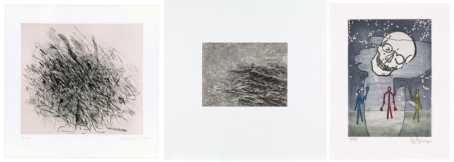From left to right: Julie Mehretu. Arms, 2021. Drypoint in one color with chine collé on Somerset Satin White paper with Gampi White collé, 15 x 15 in. (38.1 x 38.1 cm) © 2021 Julie Mehretu; Vija Celmins. Fragment, 2021. Wood engraving on handmade Gampi mounted on Rives BFK paper, 15 x 15 in. (38.1 x 38.1 cm) © 2021 Vija Celmins; Jasper Johns. Artists at Work, 2021. Soft-ground etching with aquatint and open bite printed à la poupée in six colors on Hahnemühle Copperplate Bright White paper, 15 x 11 1/2 in. (38.1 x 29.2 cm) © 2021 Jasper Johns. All images © 2021 The Met 150