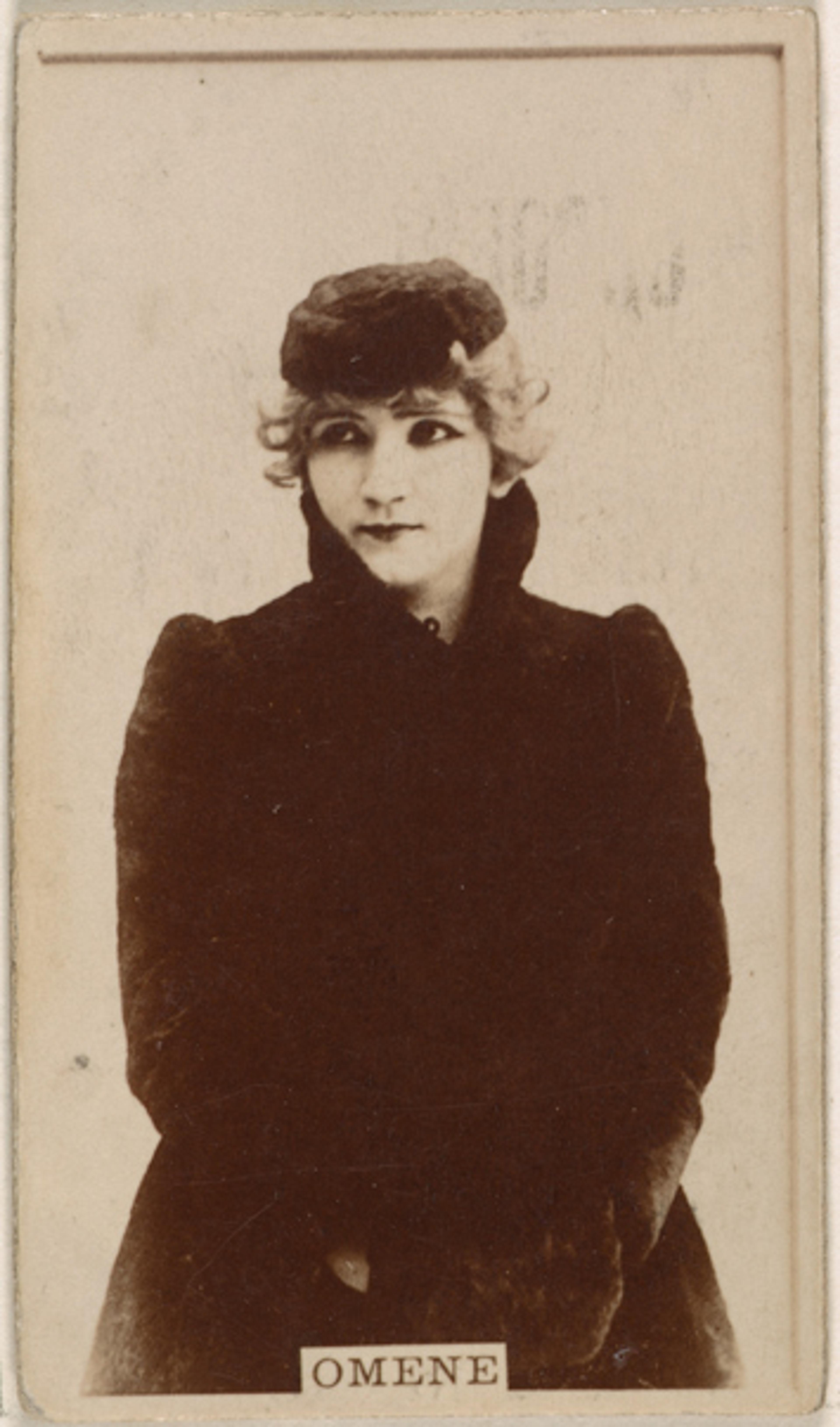 Issued by Kinney Brothers (American). Omene, from the Actresses series (N245) issued by Kinney Brothers to promote Sweet Caporal Cigarettes, 1890. Albumen photograph; Sheet: 2 1/2 x 1 7/16 in. (6.4 x 3.7 cm). The Metropolitan Museum of Art, New York, The Jefferson R. Burdick Collection, Gift of Jefferson R. Burdick (63.350.220.245.1402)