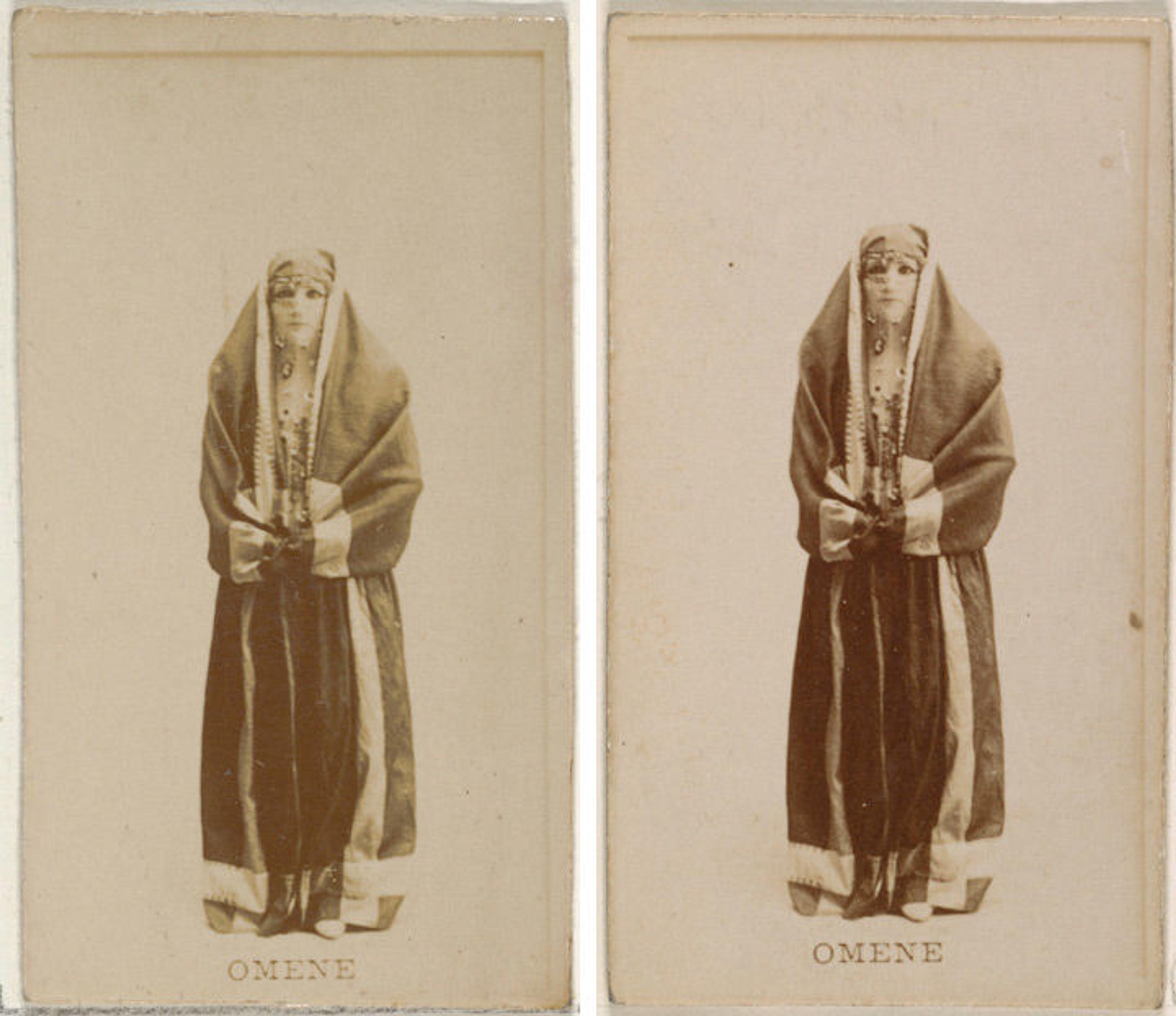 Left: Issued by Allen & Ginter (American, Richmond, Virginia). Omene, from the Actors and Actresses series (N45, Type 8) for Virginia Brights Cigarettes, ca. 1888. Albumen photograph; Sheet: 2 5/8 x 1 1/2 in. (6.6 x 3.8 cm). The Metropolitan Museum of Art, New York, The Jefferson R. Burdick Collection, Gift of Jefferson R. Burdick (63.350.203.45.1514). Right: Issued by Kinney Brothers (American). Omene, from the Actresses series (N245) issued by Kinney Brothers to promote Sweet Caporal Cigarettes, 1890. Albumen photograph; Sheet: 2 1/2 x 1 7/16 in. (6.4 x 3.7 cm). The Metropolitan Museum of Art, New York, The Jefferson R. Burdick Collection, Gift of Jefferson R. Burdick (63.350.220.245.1406)