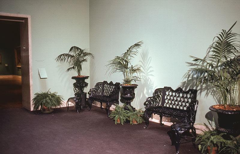 In January 1976, as part of the nation’s bicentennial celebrations, the Museum opened A Bicentennial Treasury: American Masterpieces from the Metropolitan. Part of the exhibition included a space with iron benches and large vases with potted palms and small ferns placed on the carpeted floor, reflective of the decorative use of plants in interior design that flourished during the ’70s.