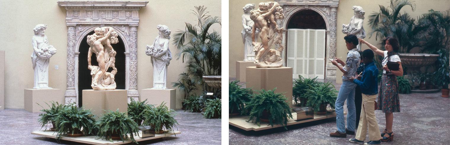 Left: A Faun Teased by Children: A New Bacchic Group by Gian Lorenzo Bernini, March 16–June 12, 1977. Right: Installation view of Bacchanal: A Faun Teased by Children, photographed in 1977