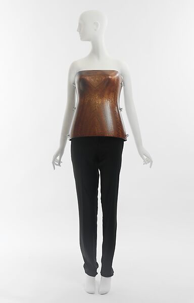 Unlike much of Hussein Chalayan's work, this corset was not created with the specific political and social narratives that generally inform his collections. However, Chalayan's reputation for an intellectual rationale to his design process is such that it is difficult, if not impossible, to assess individual examples of his work without contextualizing them in the larger body of his conceptually driven production. The essentially low-tech "bustier" stands in contrast to much of Chalayan's experimentation with unconventional materials, including some associated with aerospace technology. It does, however, relate to an earlier design from his 1993 Central Saint Martins graduation presentation and the later, beautifully rendered, "furniture" pieces that transformed into garments from his fall/winter 2000-2001 collection. With its boxing- in of the body, if only partially, the bustier recalls the kinky improvisations of archaic medical prosthesis, the sleekness of boat hulls (one is reminded of Diana Vreeland's pronouncement that jeans were the most beautiful thing "since the gondola"), and, perhaps most aptly, the confinement of coffins.