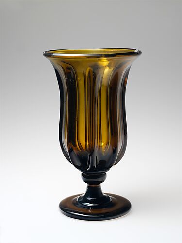 With the development of new formulas and techniques, glass-pressing technology had improved markedly by the late 1840s. By this time, pressed tablewares were being produced in large matching sets and innumerable forms. During the mid-1850s, colorless glass and simple geometric patterns dominated. Catering to the demand for moderately-priced dining wares, the glass industry in the United States expanded widely, and numerous factories supplied less expensive pressed glassware to the growing market. At the Exhibition of the Industry of All Nations at New York’s Crystal Palace in 1853, for example, the New England Glass Company exhibited 130 pieces of one design, "consisting of bowls, tumblers, champagnes, wines, and jelly glasses." This object belongs to one such service. Although the glass manufactory is not known, the glassware is very typical of the large services that were very popular with America’s middle class in the nineteenth century.