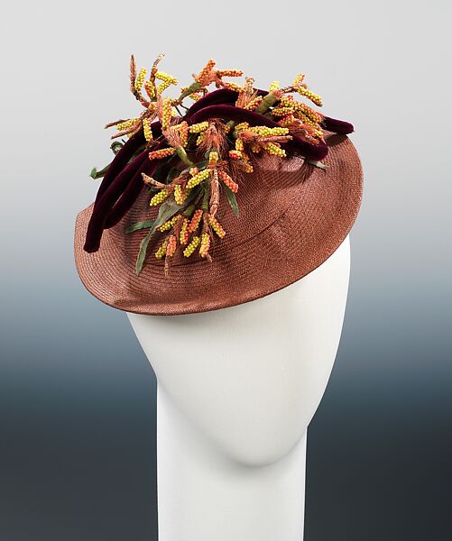 For headwear, the late 1930s marked an era of creativity in which milliners offered unusual shapes and whimsical trimmings. For this example, milliner Sally Milgrim incorporated a bouquet of autumnal grasses and berries tied with a lush velvet cord to make the straw body appropriate for fall. Careful selection of accessories suited to the time of year enabled a woman to wear wardrobe staples for more than one season. Milliners capitalized on the practice, offering appropriate seasonal themes to coordinate any outfit with the calendar.