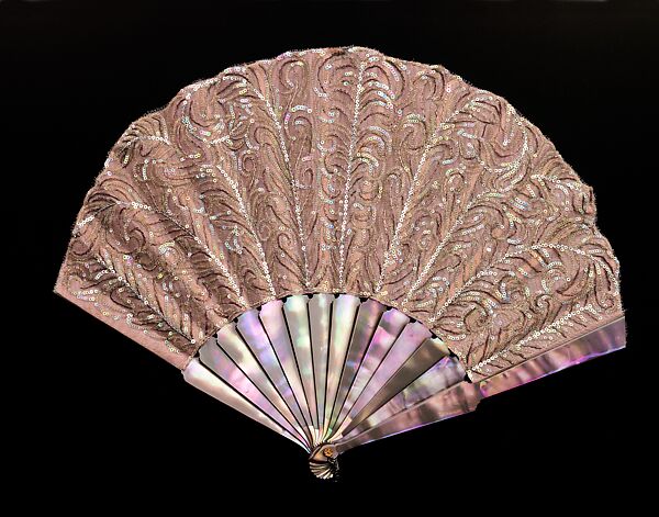 Duvelleroy was the foremost French fan maker in the late 19th and early 20th centuries. The iridescence of the mother-of-pearl and sequins give the fan a glittering visual effect and an overall harmony to the design, which is further enhanced by the dyed color of mother-of-pearl. The fine French workmanship is evident in the skillful execution of the surface decoration using small scale elements.