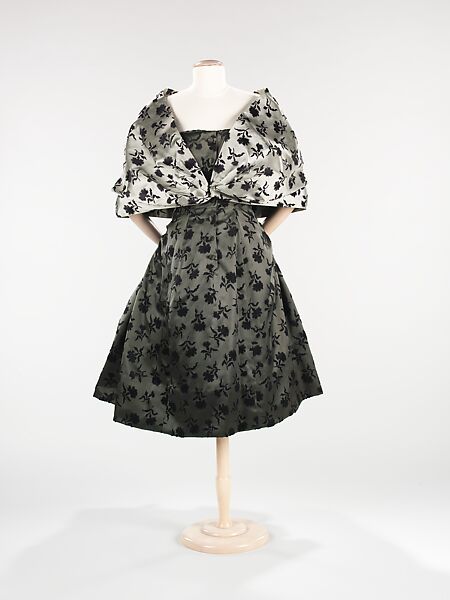 The full impact of this cocktail ensemble by Christian Dior cannot be appreciated until the dress is seen in profile, revealing the bustle effect at the back of the dress. Dior appreciated the fashions of past eras, often referencing the mid 19th-century in the scale of his skirts or shape of his portrait necklines. The example references the bustle silhouette of the 1880s, with the side draperies extending into wide ties that enhance the fullness at the center back. The textile of the stole matches a dress in the collection of the Costume Institute from the following year, a clue that Dior used the same textiles for more than one season.