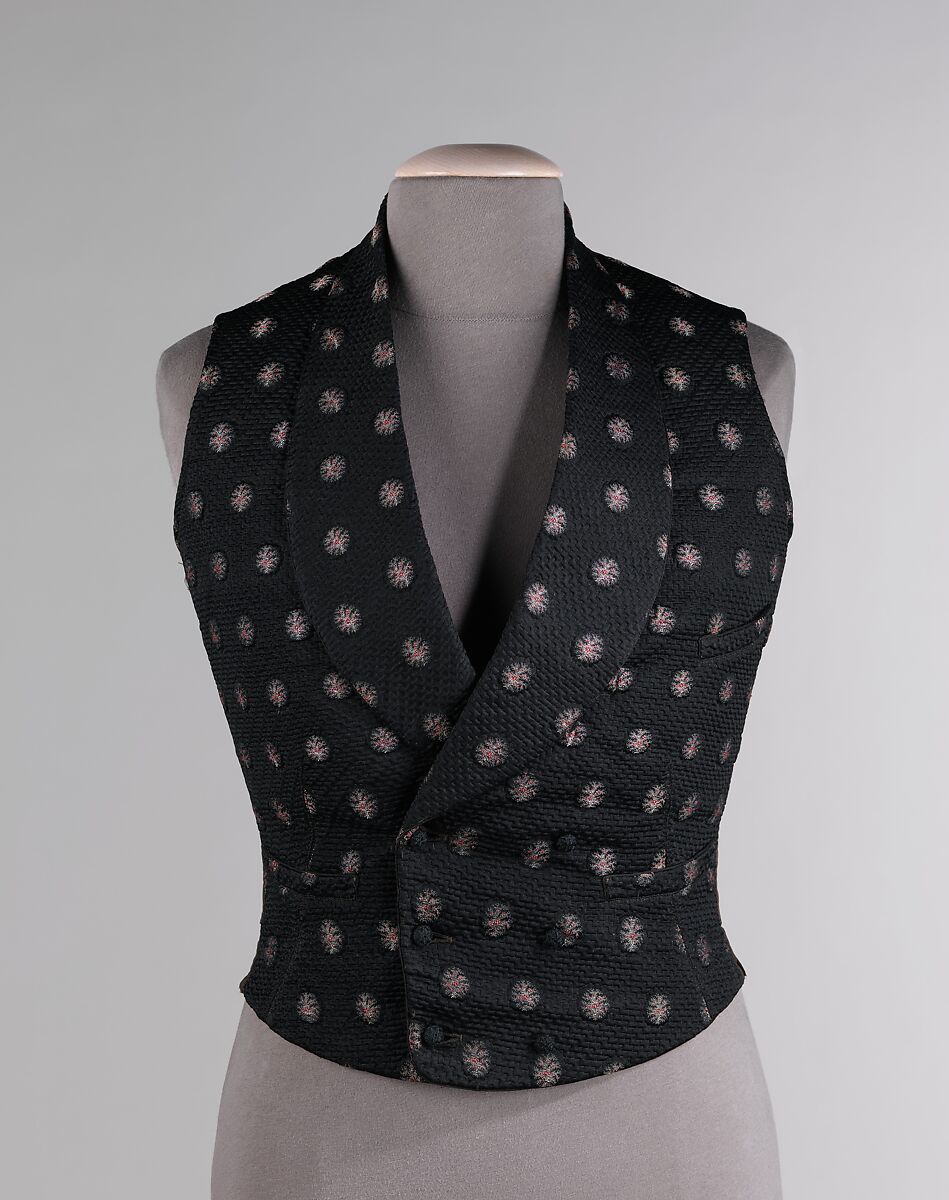 The silhouette of this vest, with its padded chest and nipped in waist, is indicative of the expected male body type popular throughout the middle of the 19th century.