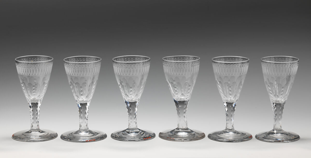 Glassmaking was one of the luxury industries that flourished in eighteenth-century Britain, advanced by local innovations like flint glass (designed to imitate Venetian glass). Drinking glasses became more common over the course of the century, accommodating a greater variety of available wines.