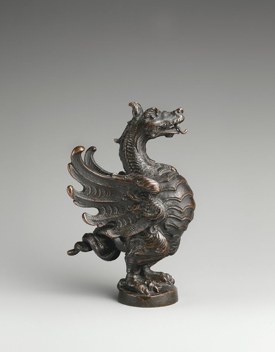 At the time of acquisition, this creature was catalogued as a griffin, but later in the 1950s James Parker correctly identified it as a dragon. The dragon was a heraldic emblem of the Borghese family, and this one was probably cast during the reign of the Borghese pope Paul V (1605–21).