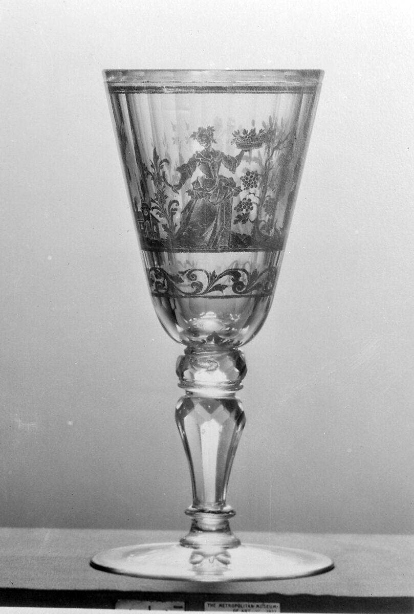 This wineglass is decorated with figures representing Autumn (grape harvest) and the other three seasons.
