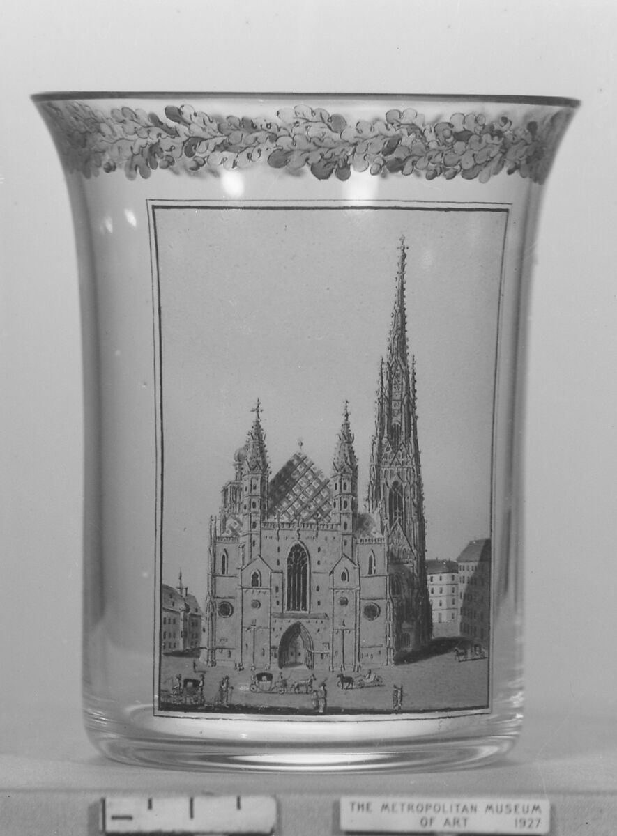 View of the Stephansdom, or Saint Stephen's Cathedral (Vienna) in bright translucent enamel. The artist, Gottlob Samuel Mohn, was the son of Samuel Mohn (1762–1815) of Dresden, the creator of highly translucent enamels for painting on glass with miniature, delicate effects. Gottlob went to Vienna in 1811 and there communicated the art to Anton Kothgasser and other glass painters.